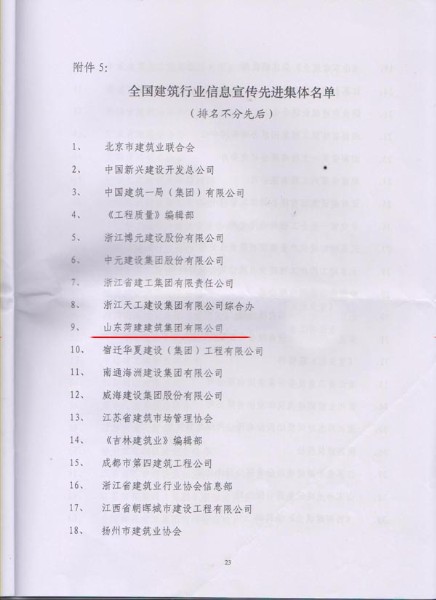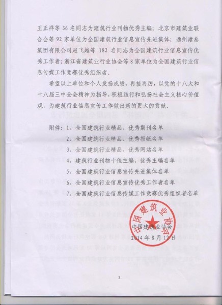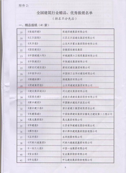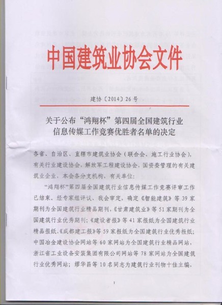 812,在中國(guó)建筑業(yè)協(xié)會(huì)下發(fā)的建協(xié)[2014]26號(hào)《關(guān)于公布“鴻翔杯”第四屆全國(guó)建筑行業(yè)信息傳媒工作競(jìng)賽優(yōu)勝者名單的決定》文件中, 按照參評(píng)要求,優(yōu)中選優(yōu)、實(shí)事求是推薦,經(jīng)中國(guó)建筑業(yè)協(xié)會(huì)組織專家評(píng)審、審核確定, 集團(tuán)公司被評(píng)為“全國(guó)建筑行業(yè)信息宣傳先進(jìn)集體”,《菏建集團(tuán)報(bào)》被評(píng)為“全國(guó)建筑行業(yè)精品報(bào)紙”,集團(tuán)網(wǎng)站被評(píng)為“全國(guó)建筑行業(yè)優(yōu)秀網(wǎng)站”,杜令瑞同志被評(píng)為“全國(guó)建筑行業(yè)信息宣傳優(yōu)秀工作者”。這是菏建集團(tuán)報(bào)紙和網(wǎng)站首次榮獲全國(guó)最高獎(jiǎng)項(xiàng),同時(shí)也填補(bǔ)了全市建筑行業(yè)信息傳媒工作中的一項(xiàng)空白。
